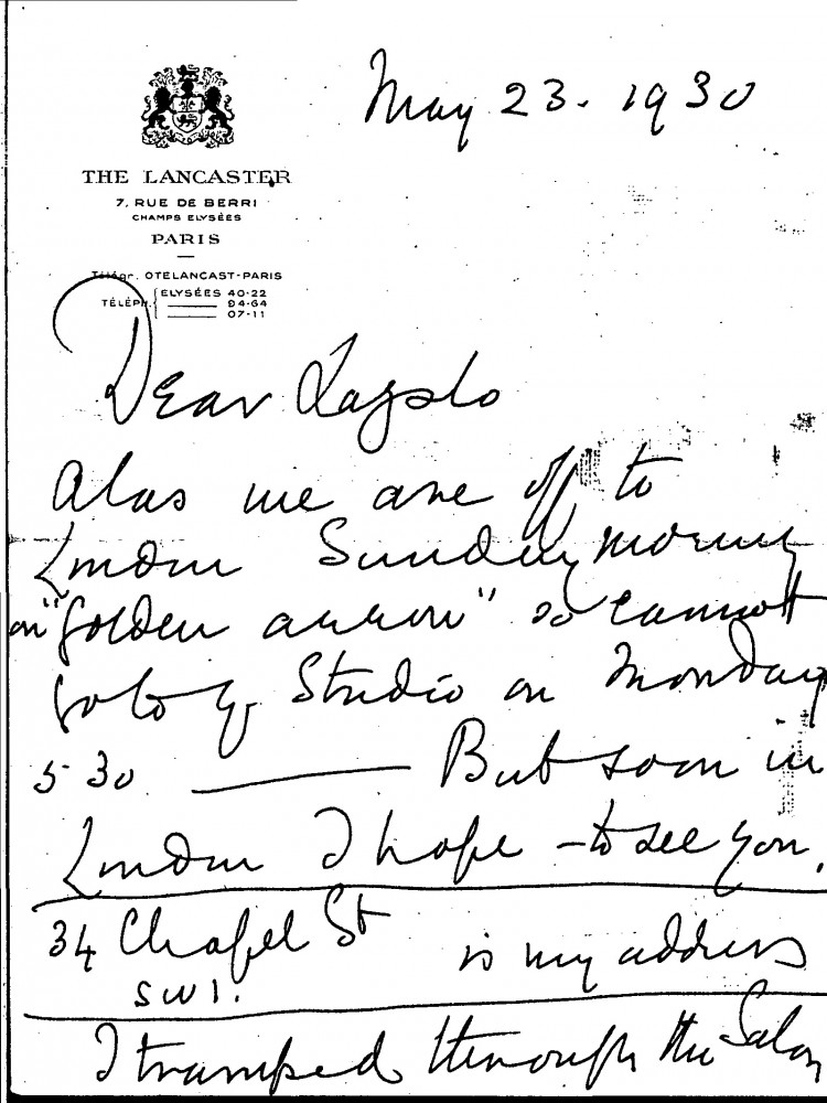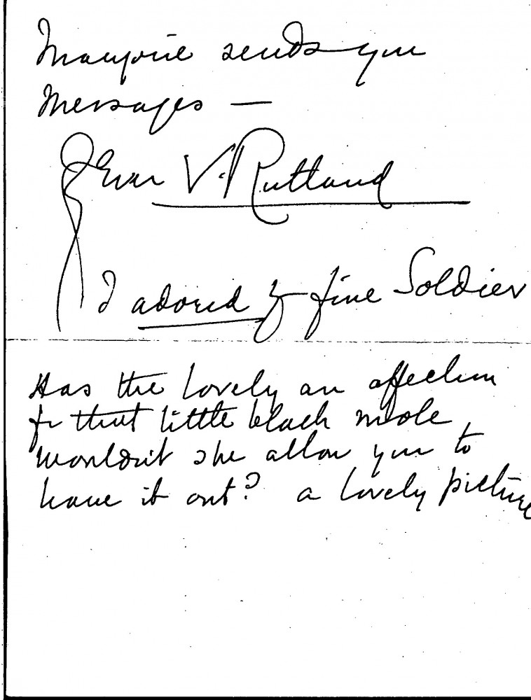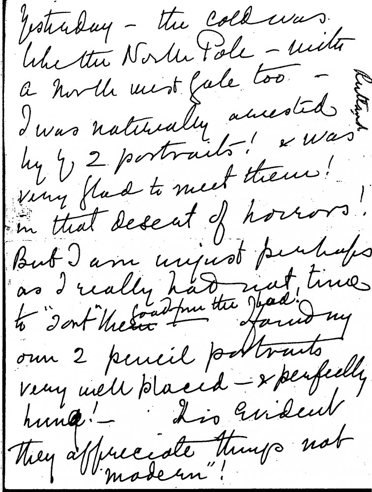 Violet Manners, Duchess of Rutland is unable to visit de László's studio on Monday. She was very taken with de László's two portraits [6118] [13322] in the Paris Salon, "that desert of horrors!". Her own two pencil portraits were well-placed. Marjorie sends her best