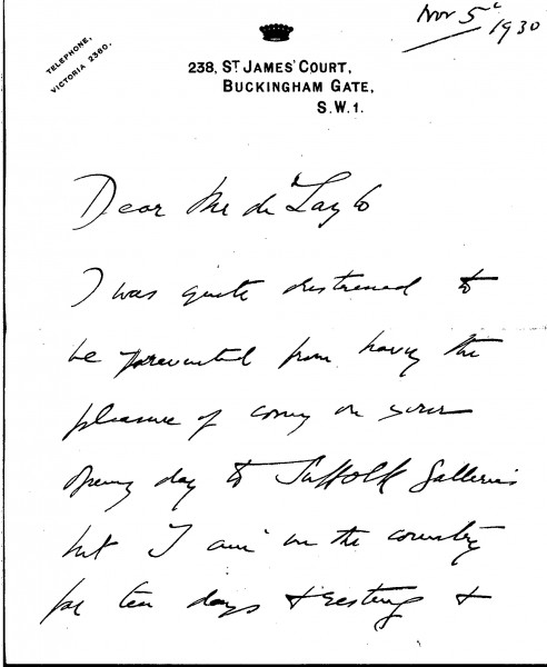 Ermine Murray, Viscountess Elibank regrets she was unable to visit the RBA exhibition on its opening day at the Suffolk Galleries; she invites de László to a party at her home
