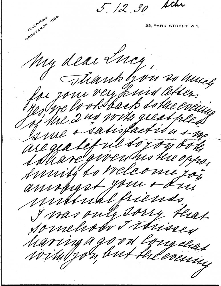 Letter from Emma von Schröder thanking Lucy for her letter and reminiscing about a recent evening spent with the de Lászlós