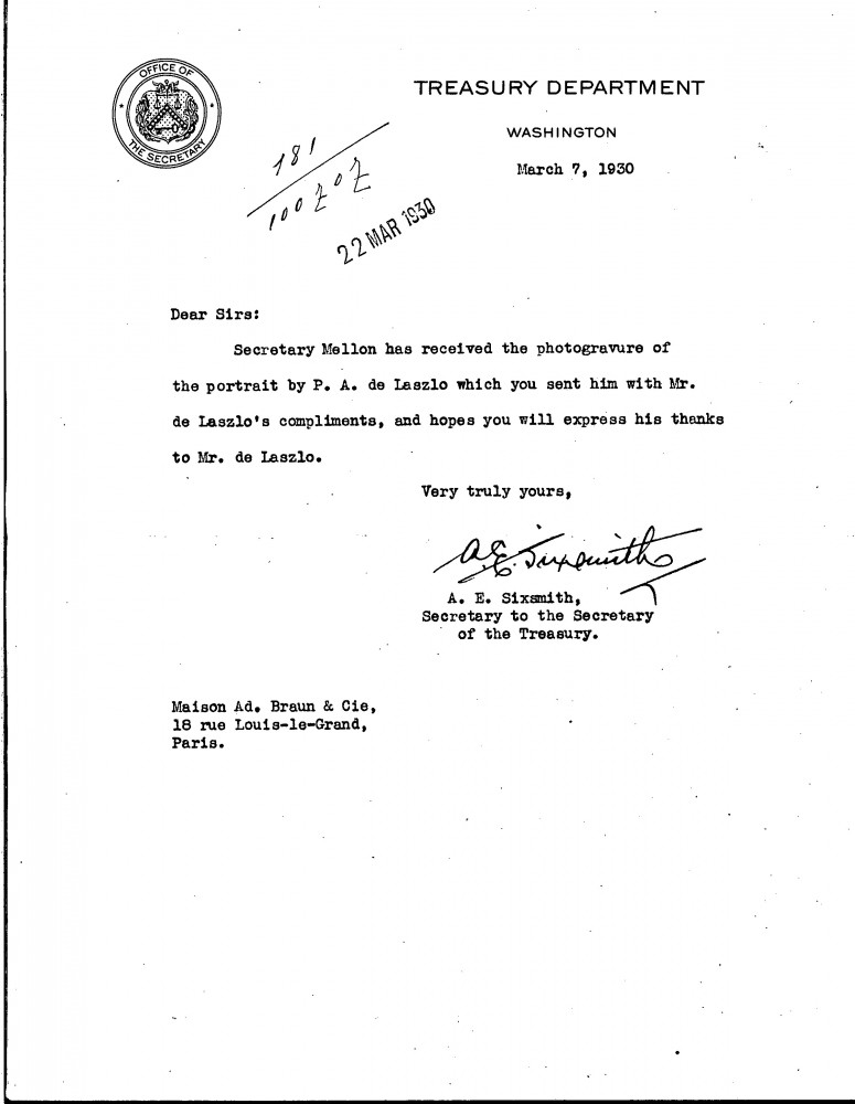 Letter on behalf of Andrew Mellon to Braun & Cie thanking de László for sending a photogravure