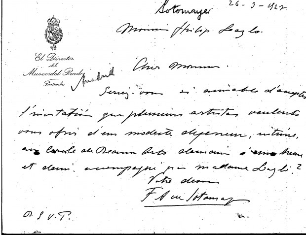 Letter from Fernando Álvarez de Sotomayor on behalf of several artists who wish to invite de László and Lucy to lunch. Item includes a second page (possibly the verso) with Mariano Benlliure's address and draft New Year's notes in English/French