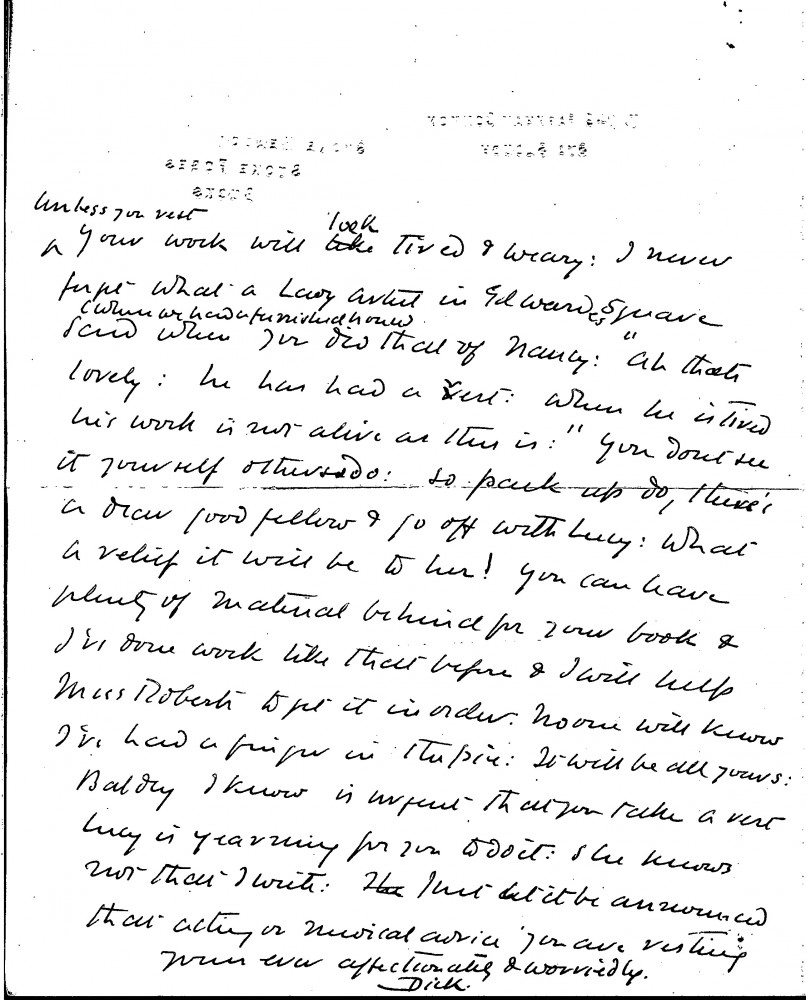 Judge Turner is very concerned that de László is overworking himself and urges him to put aside his artistic & literary work and take a holiday. He and Miss Roberts can help get the book in order (DLA017-0037 was previously archived with this item)