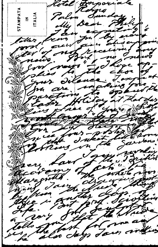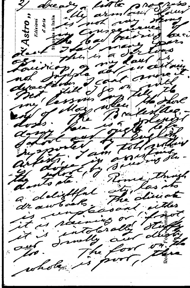 Vilmos Ruttkay de Ruttka is taking art classes at the British Academy of Art, Rome; finds climate difficult and food poor; there are many Hungarians–mentions Béthlen and Emma Fóldváry; de László is much admired there (DLA017-0143, DLA017-0140, DLA017-0139 & DLA017-0142 were partial items that have been merged into DLA017-0143, AD 25/08/21)