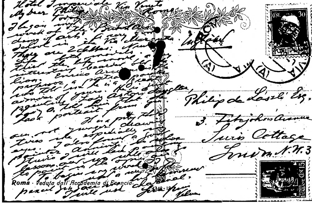 Vilmos Ruttkay de Ruttka has begun studying at the British Academy of Art, Rome under Enrico Arcioni, an admirer of de László who is painting Lady Astor's daughter; will take painting lessons from Filippo Anivitti