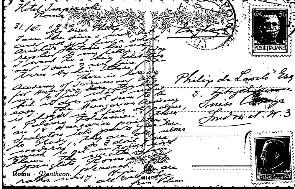Postcard from Vilmos Ruttkay de Ruttka to de László. He is in Rome and has not found a school. Aristide Sartorio has not replied; the Hungarian Academy is full of "ultra modern" painters & sculptors