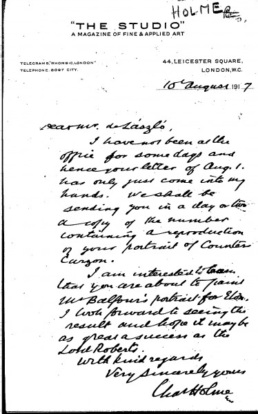 Letter from Charles Geoffrey Holme to de László regarding the reproduction of the artist's portrait of Lady Curzon [3015]. Holme is interested to learn that de László is about to paint "Mr Balfour's portrait for Eton" and hopes it will be as great a success as his portrait of Lord Roberts [6924]