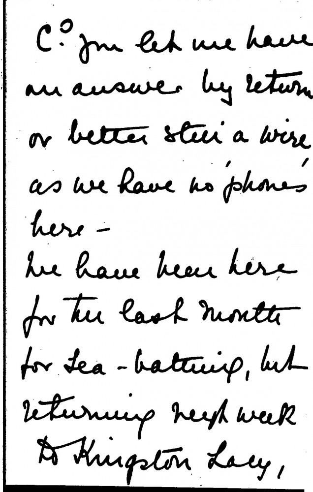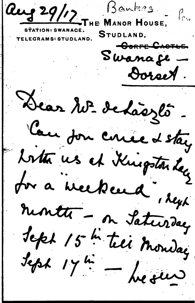 Letter from Mrs Walter Ralph Bankes inviting de László to Kingston Lacy, the Bankes family seat