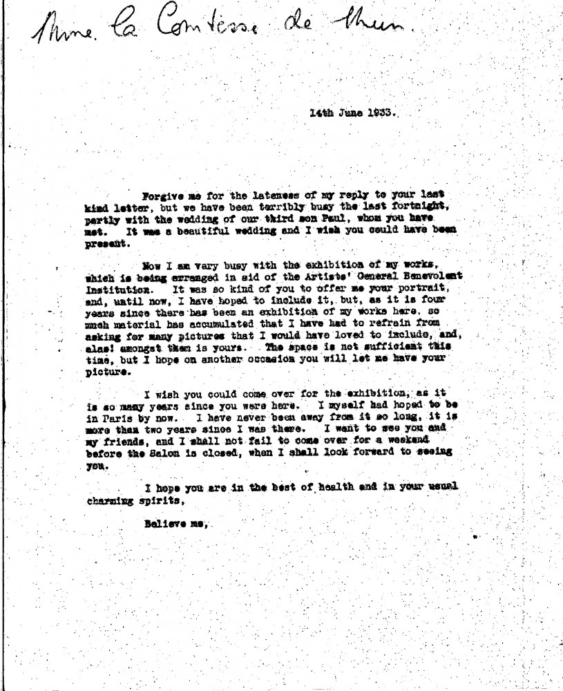 De László apologises for the delayed reply due to his son Paul's recent wedding. Regretfully, he cannot include the comtesse's study portrait [110993] in his forthcoming exhibition (Knoedler, 1933) owing to space limitations.