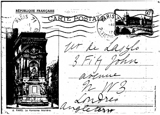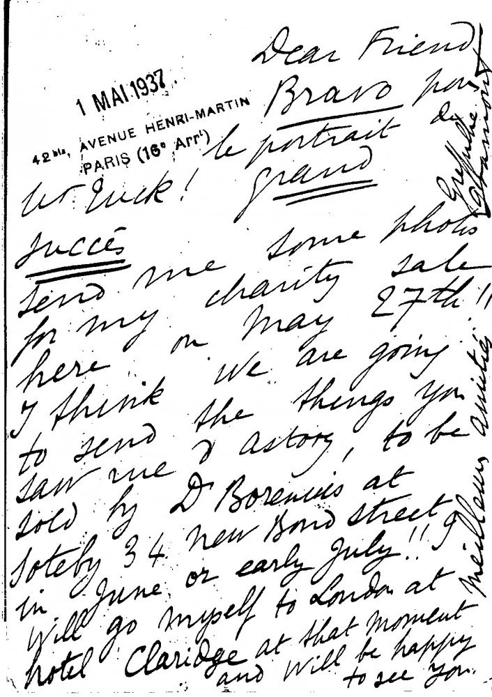 Congratulates de László on his portrait of Edward Tuck [7369] (then on view at the Paris Salon). Requests photographs for her charity sale. Items the artist saw at rue d'Astorg will likely be sold by Dr Borenius at Sotheby's.