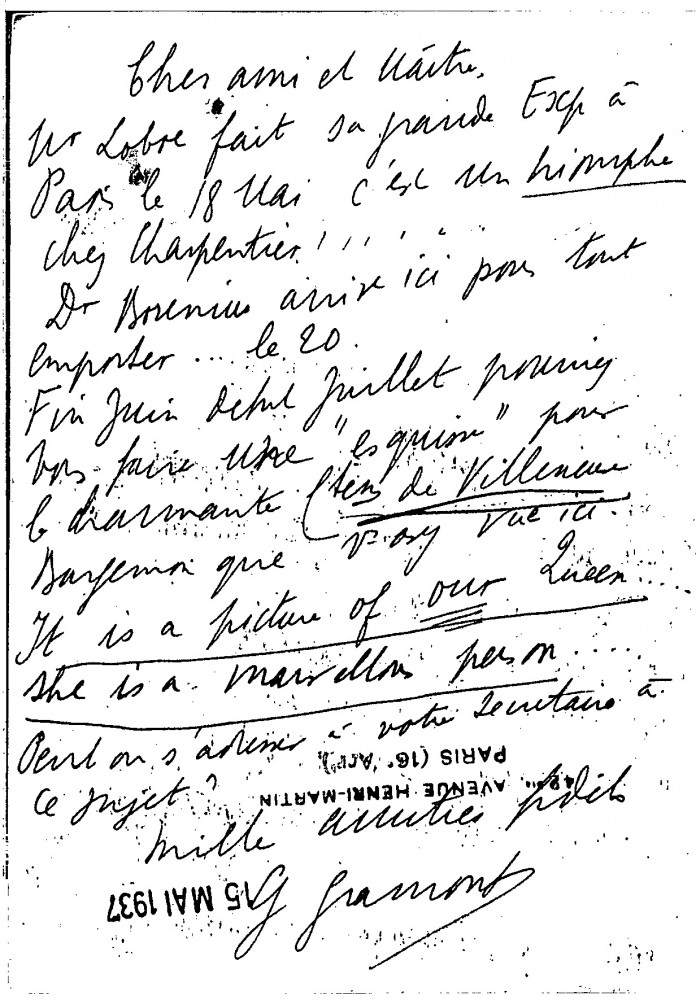 Maurice Lobre's exhibition at Charpentier is "a triumph". Dr Borenius will take everything away shortly (she was selling items from her parents' estate). Could de László make a sketch of the duchesse de Guise for the comtesse de Villeneuve-Bargemont?
