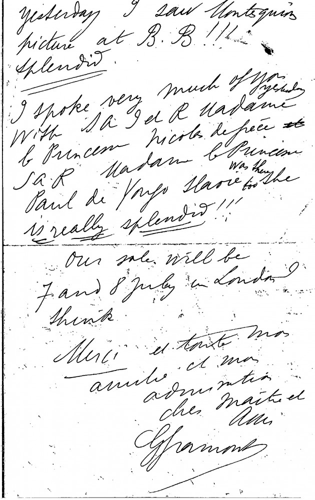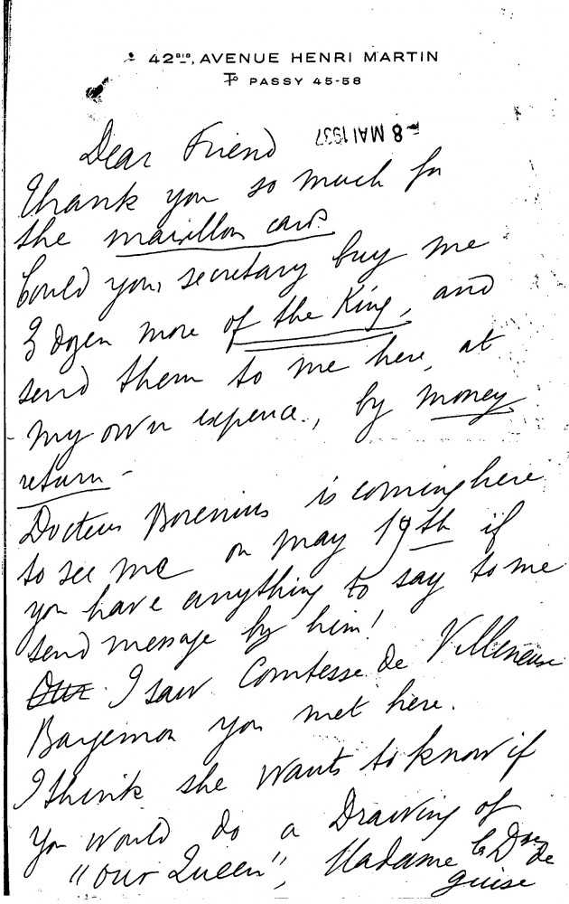 Requests more postcards of the King (for a charity auction she was organising). Borenius will visit her in Paris. She thinks the comtesse de Villeneuve-Bargemont would like de László to do a portrait of the duchesse de Guise. Saw Montesquieu’s picture at "B.B."