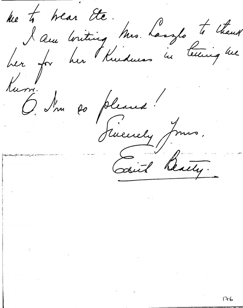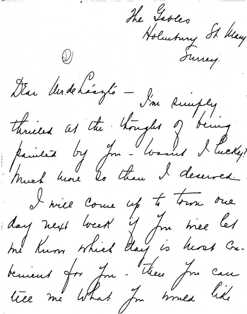 Undated letter from Lady Beatty to de László. Thankful for the opportunity to be painted, possibly won at a Red Cross Auction in support of the War Effort.