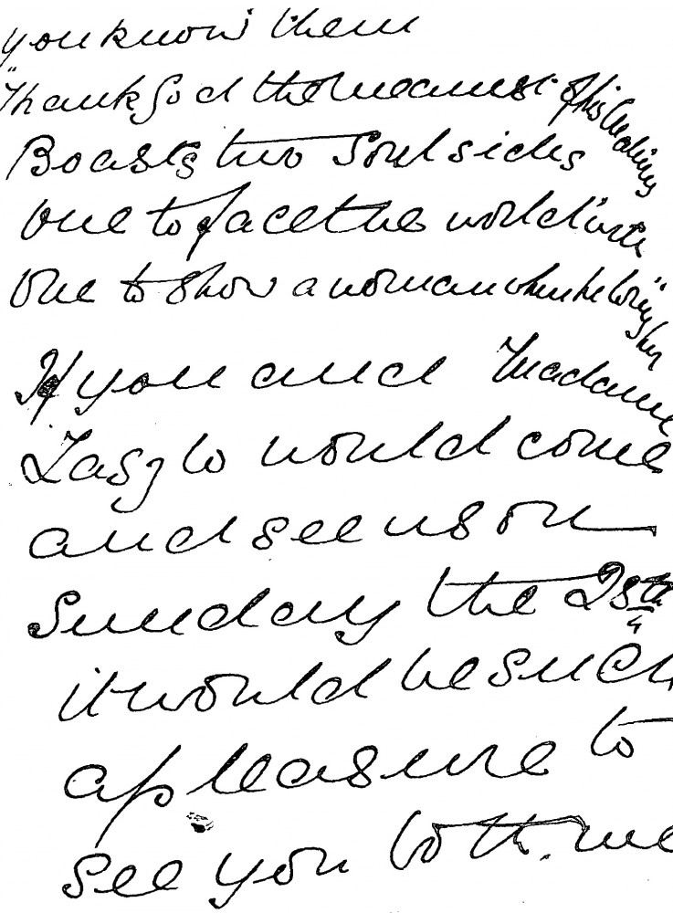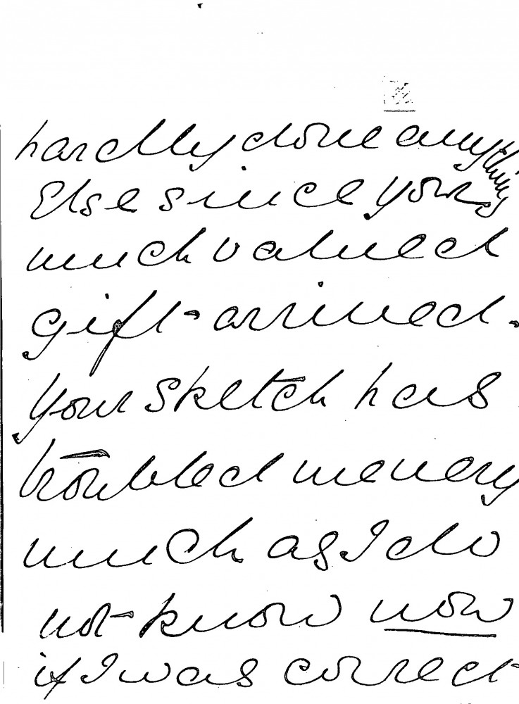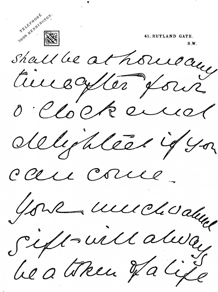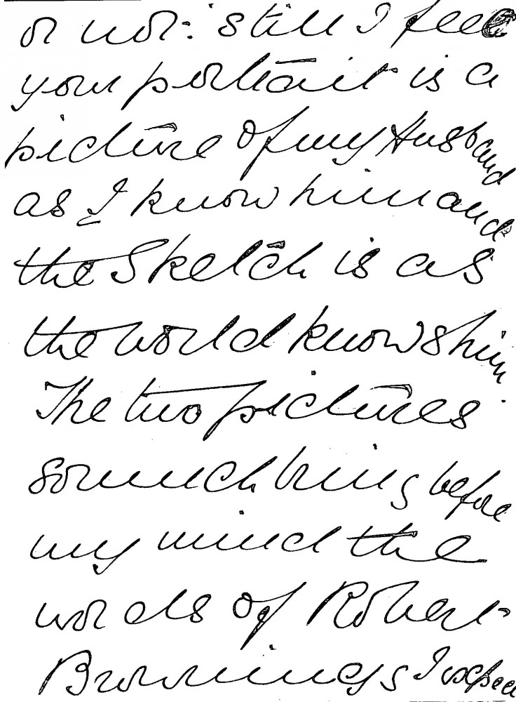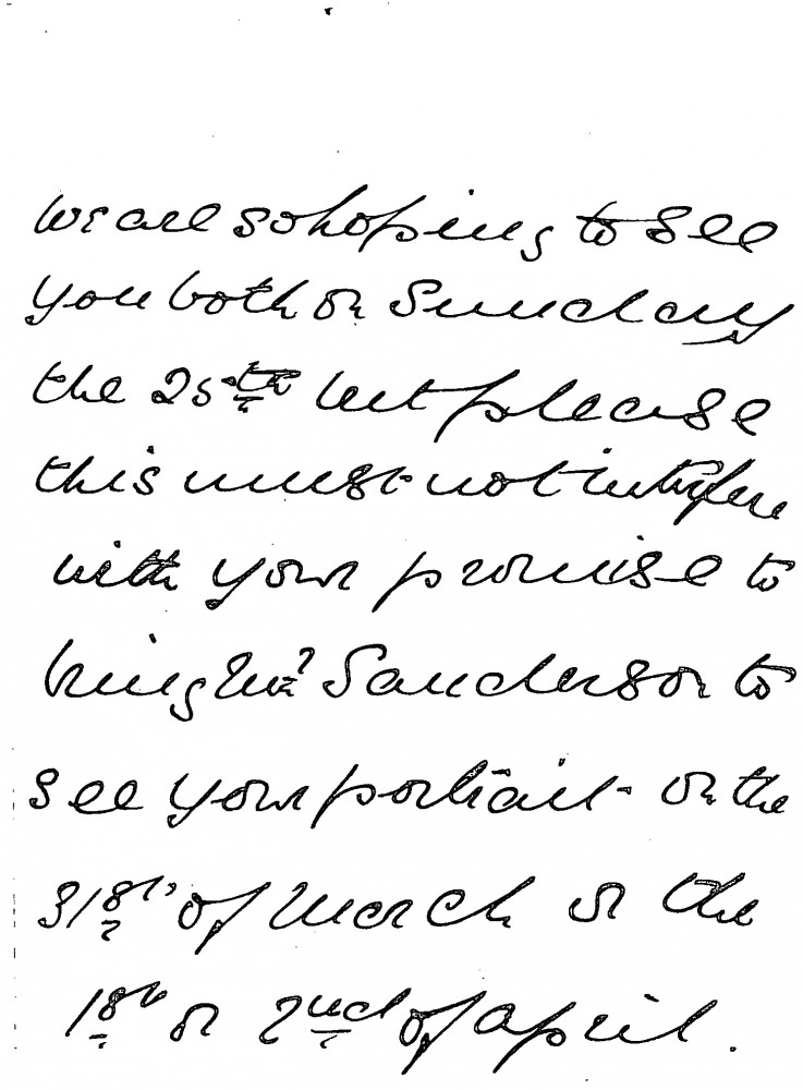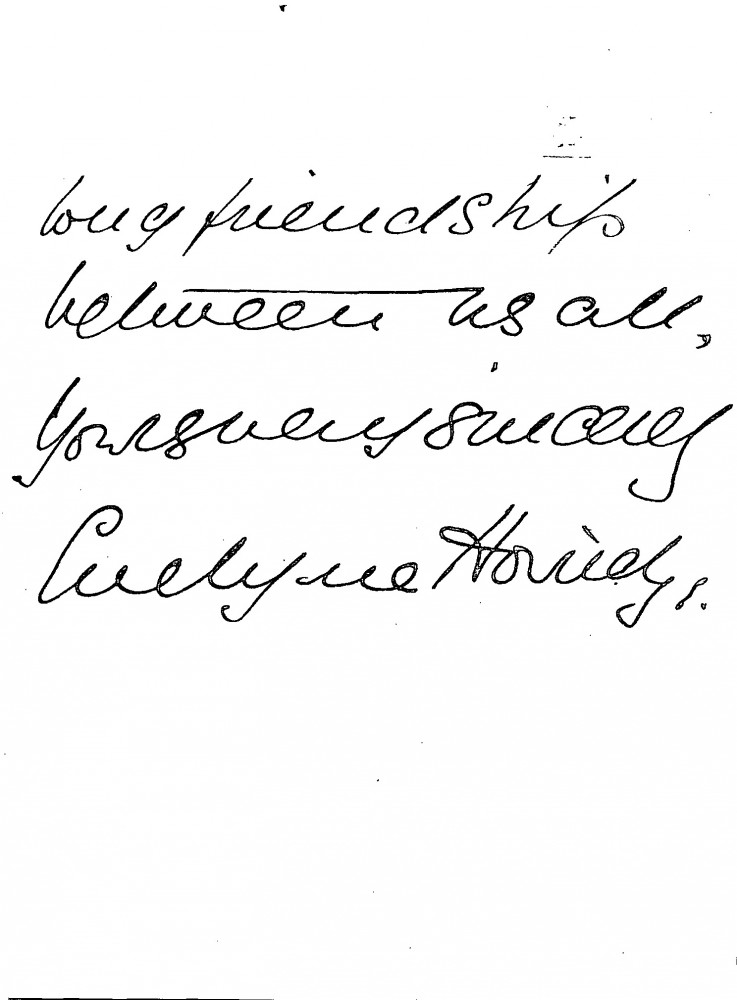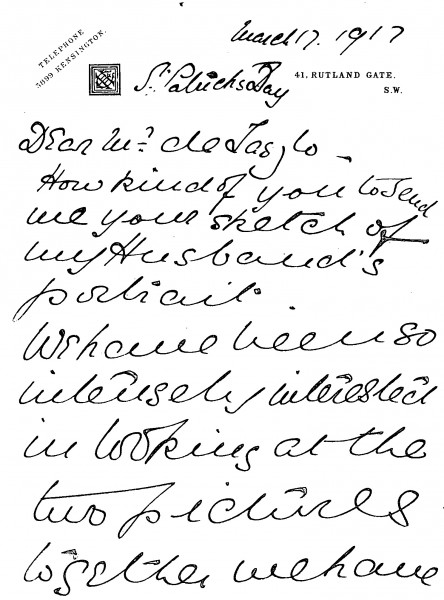 Lady Evelyne Horridge thanks de László for his gift of the study portrait [112044], which she feels depicts her husband "as the world knows him", whilst the finished portrait [5657] is as she knows him. Arrangements to bring Oswald Sanderson to see the portrait.