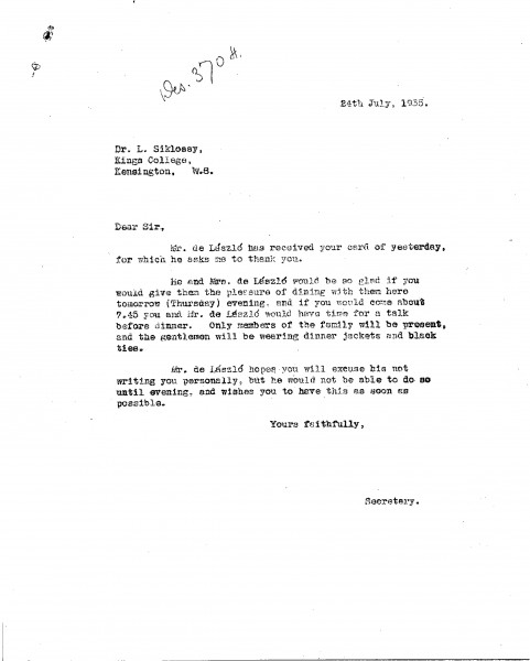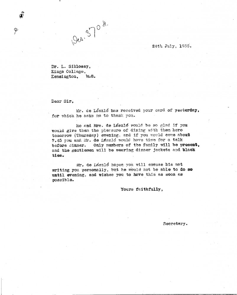 Multiple pieces of correspondence. Postcard dated 23 July 1935: Siklóssy regrets being unable to accept de László’s invitation due to a prior commitment but looks forward to discussing the book soon. Letter dated 24 July 1935: De László’s secretary extends an invitation from the de Lászlós to dinner.