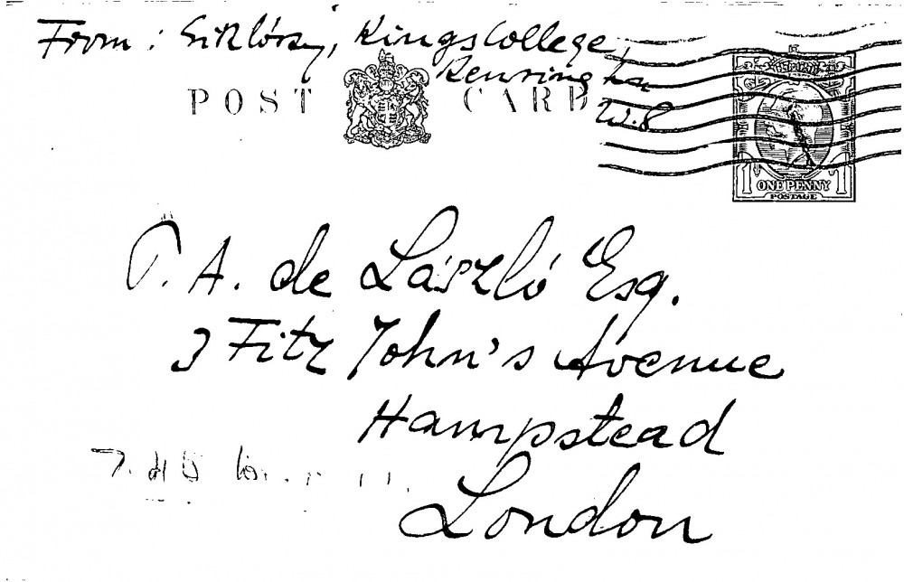 Postcard from Dr László Siklóssy to de László; letter from de László's secretary to Dr László Siklóssy, Letters Personal 1934 from N to Z 1935, 023-0151