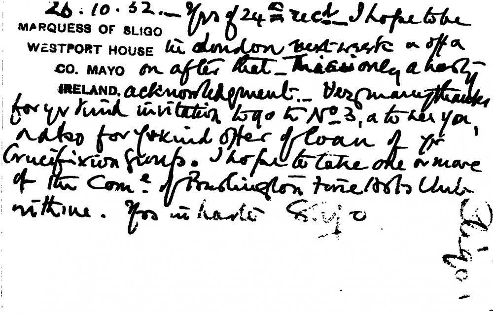 The Marquess of Sligo thanks de László for the invitation and the proposed loan of his Crucifixion group.