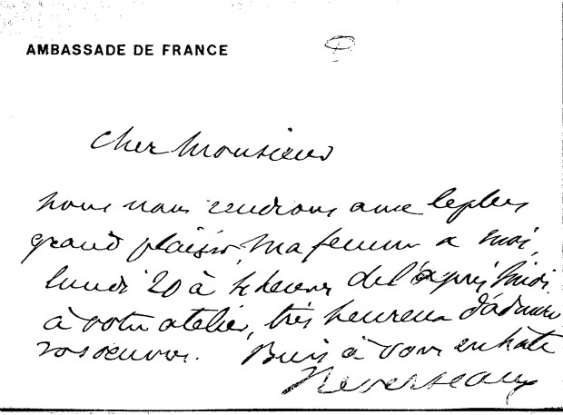 Letter from the Marquis Jacques Frédéric de Reverseaux de Rouvray, French Ambassador in Vienna (1897-1907), to de László regarding a studio visit