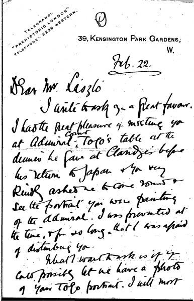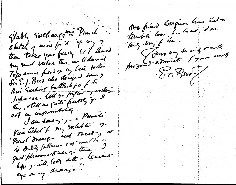 Edward Tennyson Reed asks de László for a photograph of his portrait of Admiral Togo [110587]. Togo had been a friend of Reed's father, a naval architect who designed battleships for the Japanese. In return, Reed will exchange a Punch sketch of his. Reed also sends a private view ticket for his exhibition of drawings at the Dudley Galleries, he mentions Theodore Blake Wirgman's loss, and ends the letter by expressing his "profound admiration" for de László's work (DLA010-0021 was previously archived with this item)