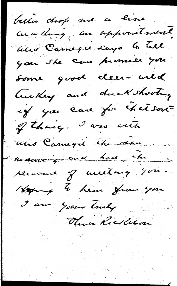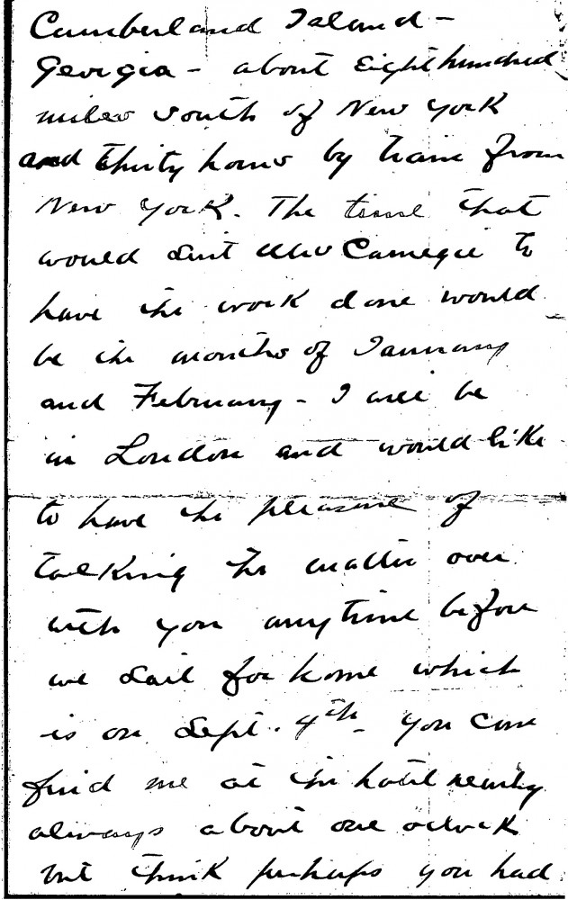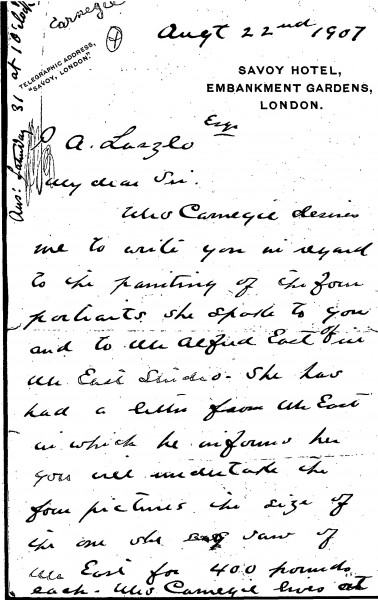 Letter from Oliver Garrison Ricketson on behalf of Mrs Thomas Morrison Carnegie to de László concerning a commission. Ricketson outlines that Mrs Carnegie had seen de László's portrait of Alfred East [3385] in the latter's studio whilst in the company of de László. East subsequently informed Mrs Carnegie that de László agreed to paint four portraits of the same size as [3385] for £400 each. January/February of 1908 would suit Mrs Carnegie, who lives in Cumberland Island, Georgia