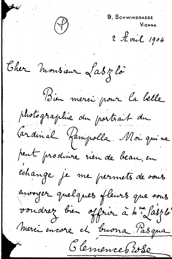 Letter from the journalist Clémence Rose to de László thanking the artist for the photograph of his portrait of Cardinal Rampolla [4511]