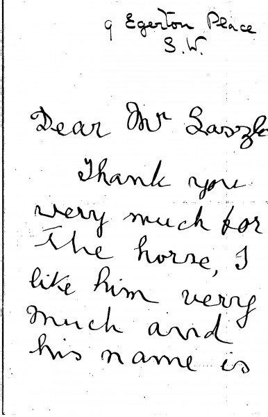 Diane Chamberlain thanks de László for the horse; includes a little drawing she has made of the artist.