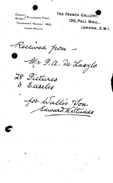 Wallis & Son confirms receipt of 28 pictures and 6 easels from de László.
