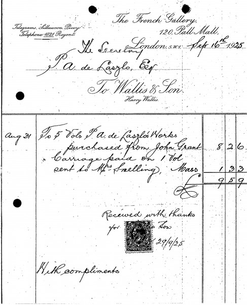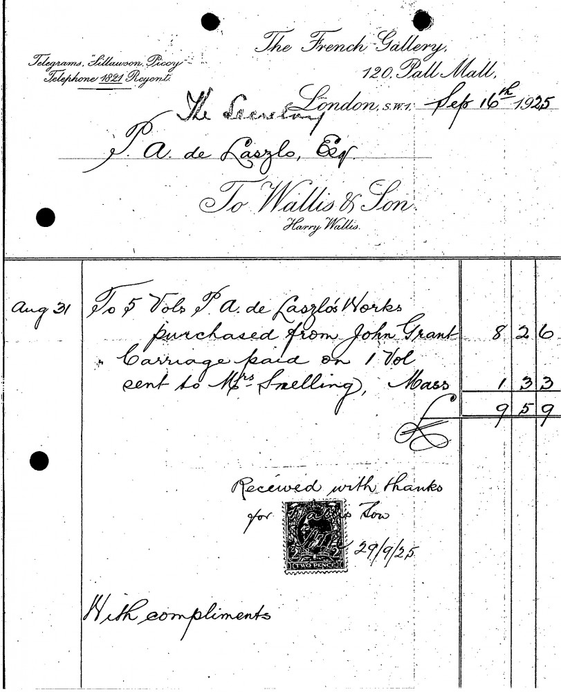 Receipt from Wallis & Son for 5 vols. of "P. A. de Laszlo’s Works, purchased from John Grant"; carriage of one to Mrs Snelling.