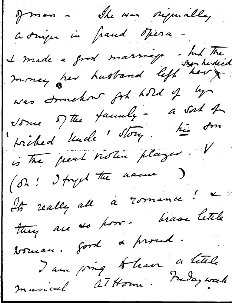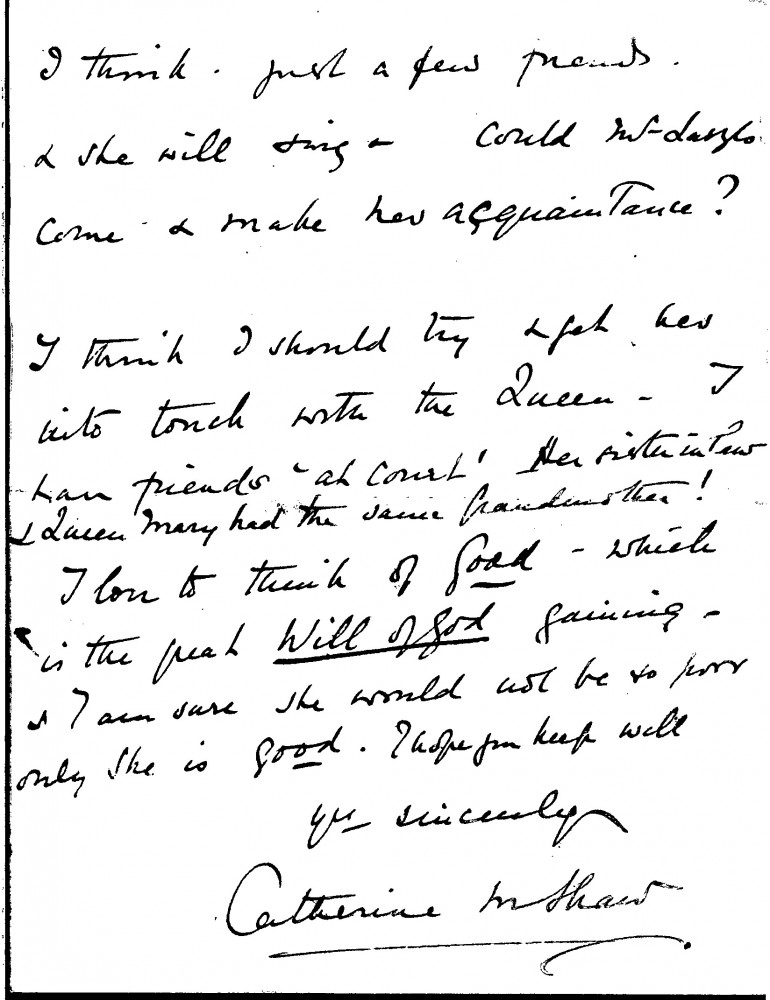 Letter from Catherine M. Shaw to Lucy de László asking if de László will make the acquaintance of a Hungarian singer who the author has been working with on some music and who is in straightened circumstances
