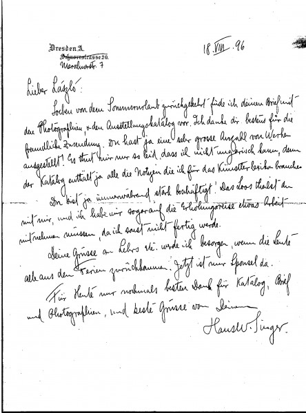 Letter from the German art historian, Hans Wolfgang Singer, to de László thanking the artist for sending photographs and an exhibition catalogue. Were it not in Hungarian, Singer observes that the catalogue would be useful for his own publication, the Allgemeines Künstler-Lexikon. He notes that de László has exhibited "a very large number of works" (Singer is possibly referring to the Millennium Exhibition held at the Műcsarnok, Budapest in 1896)