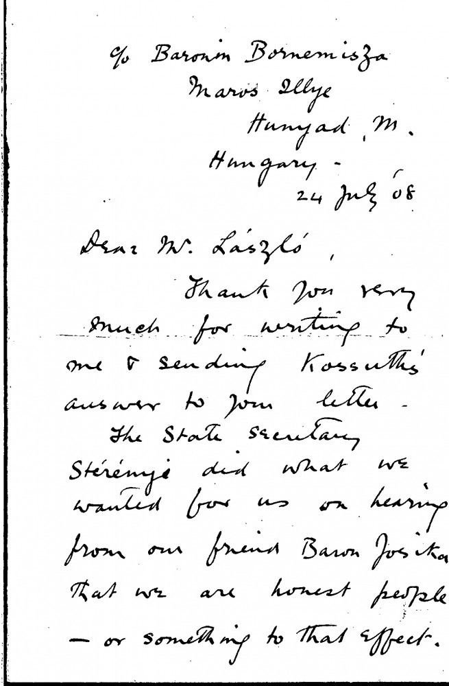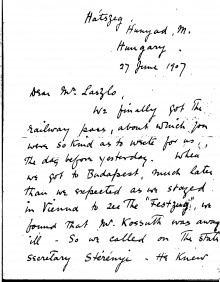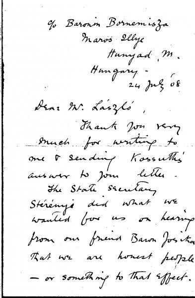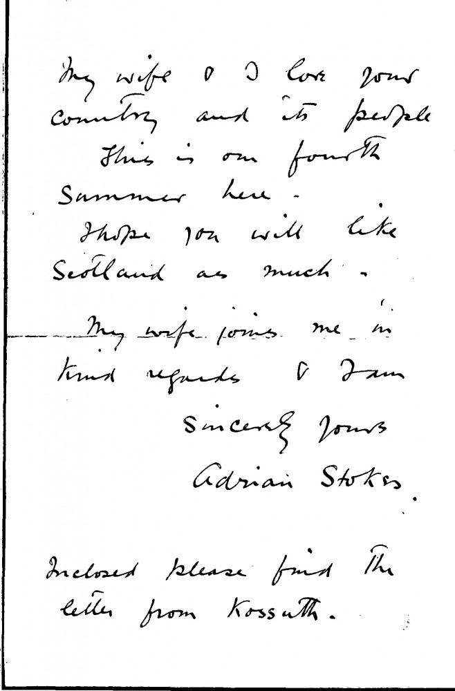 Letter from Adrian Scott Stokes to de László regarding a favour that Stokes had asked of Baron József Szterényi (see also DLA011-0015). Stokes thanks de László for sending Kossuth's (likely Ferenc Kossuth) answer to his (de László's) letter and encloses another letter from Kossuth. "My wife and I love your country and its people", Stokes exclaims