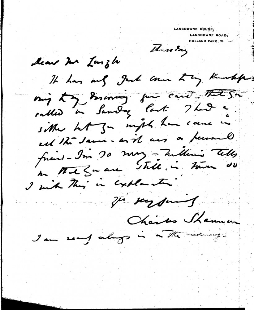 Undated letter from the English painter, Charles Haslewood Shannon, apologising for not seeing de László when he called; Shannon was with a sitter at the time. The sitter was a personal friend, however, and so de László could have come in