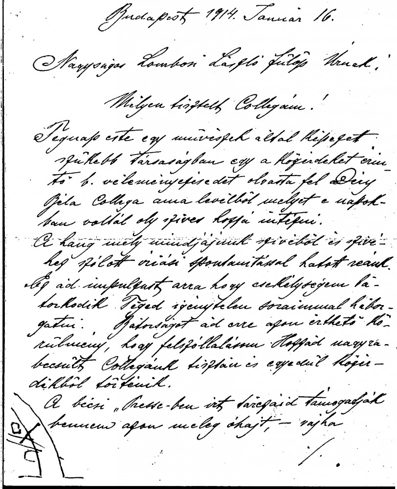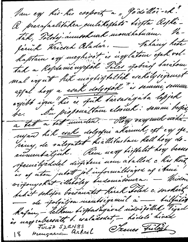 Letter from Hungarian painter Fülöp Szenes regarding a letter from de László that had been read out at a gathering of artists, which "touched all our hearts and which spoke to us all"; refers to de László's articles in Viennese press. Mentions "sad and unfortunate dissension that exists in our homeland". Refers to invitation he received from Gödöllő Group to join movement; it is an honour that de László has been in contact with the group