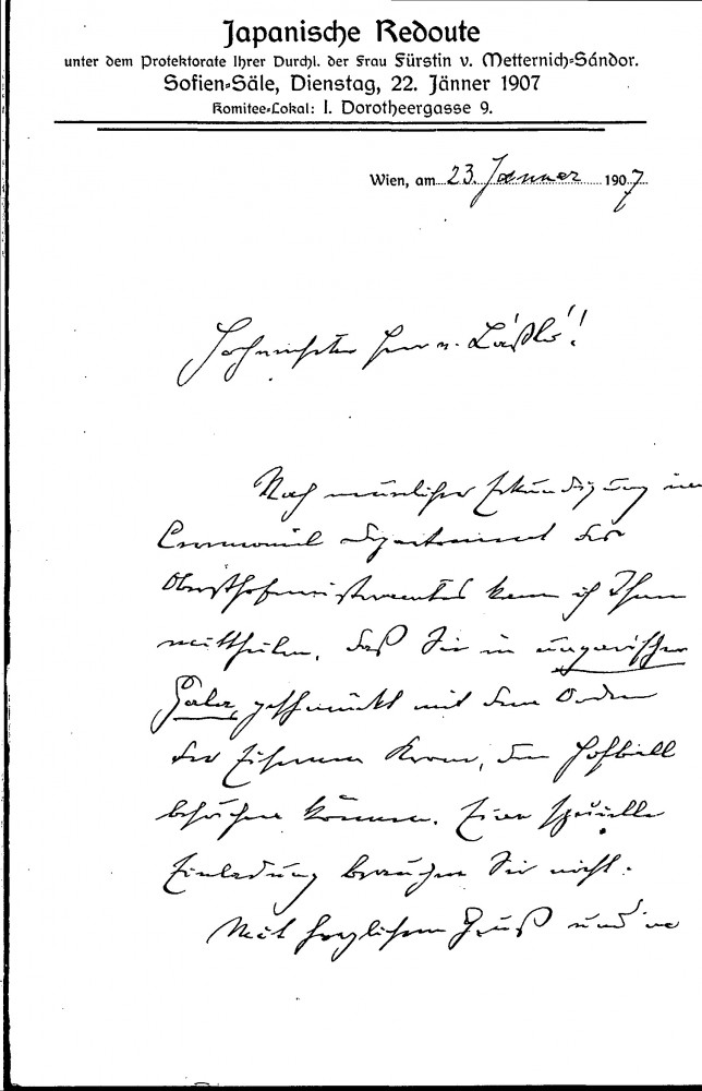Letter from Edgar Spiegl von Thurnsee inviting de László to a Court Ball, which the artist can attend decorated with the Order of the Iron Crown