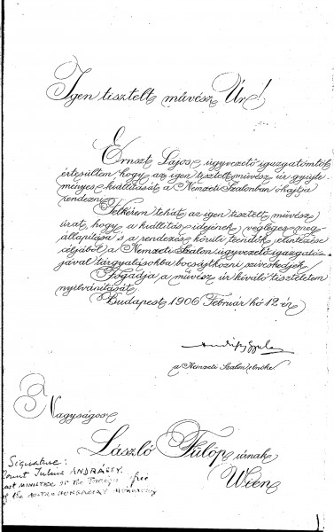Letter from Count Gyula Andrássy, in his capacity as President of the Nemzeti Szalon, writing to say that he has heard from the Director of the Szalon, Lajos Ernst, that de László is planning to have an exhibition there, and asking him to contact Ernst to discuss this