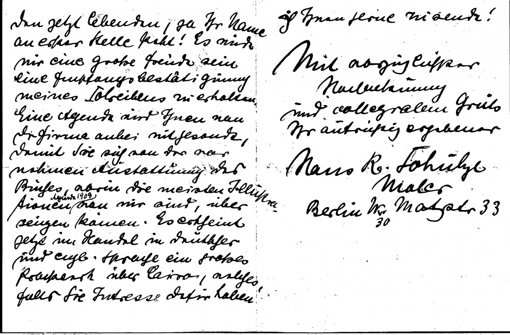 Letter from painter Hans R. Schulze to de László regarding reproduction of paintings in a Rudolf Hertzog publication, the subject of which appears to be famous painters of beautiful women (although unclear). De László seems to have bought a work by Schulze (depicting swans) years earlier