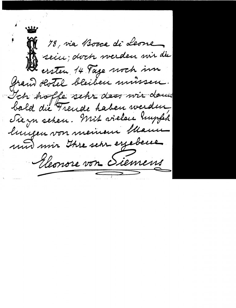 Eleonore von Siemens and her husband are looking forward to seeing the artist in Rome. She passes on her regards to Bishop Vilmos Fraknói and writes of her admiration of the artist's work thus (DLA011-0057 and DLA011-0058 were previously partial items that have now been merged into DLA011-0057. DLA011-0058 has been deleted, AD 04/03/21)