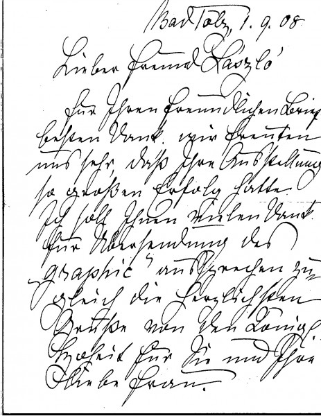 Letter from Nelly von Schmidt to de László in which she writes of how happy they are that the artist's exhibition was so successful, and she thanks him for sending The Graphic. Regarding the artist's proposed trip to Sigmaringen, the Fürst, who would like his daughter painted if the financial situation allows, has said that mid-December would be fine. She adds that the Fürstin is still ill