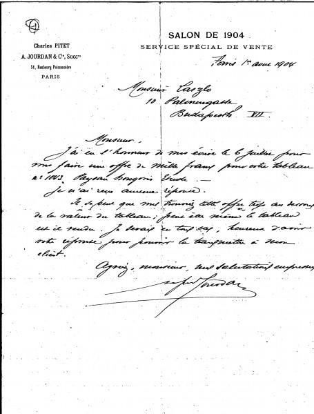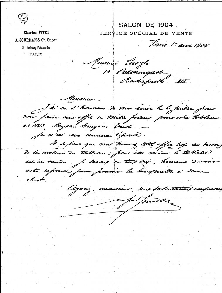 Letter from Arthur Jourdan to de László following up on an earlier letter in which he offered, on behalf of a client, 1000 francs for the artist's study of a Hungarian peasant [110949] that was exhibited at the 1904 Paris Salon