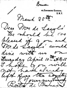 Lady Berta Mary de Bunsen invites Lucy and de László to dinner (DLA018-0088 was previously archived with this item).