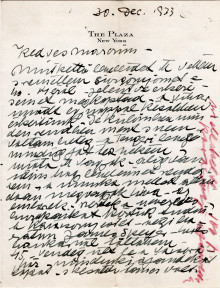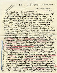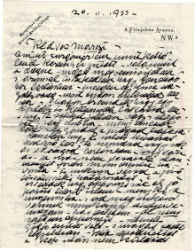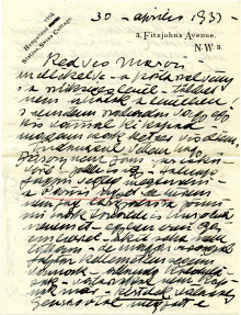 Inquiring about Marczi's debt, sent a suit. Reference to a problem in Paris with a "disagreeable wretch" (see also DLA135-0005). De László's exhibition will open in June (Knoedler, 1933). Started to make studies for his "big canvas".