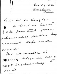 The Archive Filter search More options DLA number submit Date All 1892 1893 1894 1895 1896 1897 1898 1899 1900 1901 1902 1903 1904 1905 1906 1907 1908 1909 1910 1911 1912 1913 1914 1915 1916 1917 1918 1919 1920 1921 1922 1923 1924 1925 1926 1927 1928 1929 1930 1931 1932 1933 1934 1935 1936 1937 1956 1986 2016 Sender / Creator All “Árpád” Cooperative Society (2) Abels, Ludwig (1867 - 1937) (1) Aberconway, Charles Benjamin Bright McLaren, 1st Baron (1850 - 1934) (5) Acton of Aldenham, Richard Maximilian Lyon-Dalberg-Acton, 2nd Baron (1870 - 1924) (1) Aczél, Madame Edward [née Anny, surname unknown] (1) Agen, Boyer d' (1857 - 1945) (3) Agnew, William Lockett (1858 - 1918) (2) Ahlefeldt-Laurvig, Count Preben Ferdinand (1872 - 1946) (1) Aiken, William (1880-1950) (2) Ainger, Arthur Campbell (1841-1919) (1) Ainsworth, J.S. (1) Airlie, Mabell Ogilvy, Countess of [née Lady Mabell Frances Elizabeth Gore]; wife of 11th Earl (1866 - 1956) (1) Albemarle, Arnold Allan Cecil Keppel, 8th Earl of (1858 - 1942) (4) Albemarle, Gertrude Keppel, Countess of [née Lady Gertrude Lucia Egerton]; wife of 8th Earl (1861 - 1943) (1) Alexander, Mrs John White [née Elizabeth Alexander] (1) Alfred, G. (4) Allez, Mrs Jacques [née Mary Astor Paul; other married name Mrs Charles A. Munn] (1889 - 1950) (4) Almásy, László (1869 - 1936) (1) Amshewitz, John Henry (1882 - 1942) (6) Andrassy de Csíkszentkirály et Krasznahorka the Younger, Count Gyula (1860 - 1929) (1) Annesley, Priscilla Annesley, Countess of [née Priscilla Cecilia Armitage Moore]; wife of 5th Earl (1892 - 1941) (1) Anson, Sir William Reynell, 3rd Baronet (1843 - 1914) (1) Anthony, Geo. Hy. (1) Apponyi de Nagyappony, Count Albert (1846 - 1933) (1) Apsley, Allen Algernon Bathurst, Lord (1895 - 1942) (1) Aramon, Rita d' (1) Armstrong, Ronald (1) Armstrong, Sir Walter (1850 - 1918) (1) Arti et Amicitiae (1) Asquith, Lady Cynthia Mary Evelyn [nee Charteris] (1887-1960) (1) Astley, Mrs Philip [née Madeleine Carroll; other married names Mrs Sterling Hayden, Mrs Henri Lavorel and Mrs Andrew Heiskell] (1906 - 1987) (1) Astor of Hever, Lady [née Lady Violet Mary Elliot-Murray-Kynynmound; other married name Lady Charles Petty-Fitzmaurice] (1889 - 1965) (1) Athlone, Princess Alice of [née Princess Alice of Albany]; wife of 1st Earl (1883 - 1981) (6) Austria, Archduchess Friedrich of [née Princess Isabella von Croÿ-Dülmen] (1856 - 1931) (3) Austria, Archduke Ludwig Viktor of (1842 - 1919) (1) Aybar, Miguel González de Castejón y Elío, I conde de (1862 - 1939) (1) B. Holden & Co. (1) Bacsich, Máté (2) Baden-Powell, Lord Robert Stephenson Smyth Baden-Powell, 1st Baron (1857 - 1941) (2) Baden, Margravine of [née Princess Theodora of Greece and Denmark]; wife of Prince Berthold (1906 - 1969) (1) Baeyens, Baronne Marcel [née Suzanne Desmons] (1884 - 1949) (6) Bailey, J. R. (16) Bajza, Aladar (1) Baker, Constable Albert (1) Baldry, Alfred Lys (1858 - 1939) (48) Baldwin of Bewdley, Stanley Baldwin, 1st Earl (1867 - 1947) (1) Balfour of Dawyk, Lieutenant-Colonel Frederick Robert Stephen (1873 - 1945) (1) Balfour, Arthur James Balfour, 1st Earl of (1848 - 1930) (2) Bálint, Zoltán (1871 - 1939) (1) Balló, Ede (1859 - 1936) (10) Balló, Mrs Ede [née Margit Vámossy] (2) Balog, Elemér (1881 - 1955) (1) Balogh, Loránd Almási (1) Bankes, Mrs Walter Ralph [née Henrietta Jenny Fraser] (1871 - 1953) (1) Barbour, Doctor Alexander Hugh Freeland (1856 - 1927) (1) Barclays Bank Ltd. (1) Bárczy de Bárcziháza, István (1882 - 1952) (10) Bárczy de Bárcziháza, Madame István [née Edit Luczenbacher de Szob] (1888 - 1973) (2) Bárdossy, László (1890 - 1946) (2) Baring, Lady Ulrica [née Lady Ulrica Dunscombe] (1875-1935); wife of Brigadier-General the Hon. Everard Baring (1875 - 1935) (1) Barnaby, J. (3) Barratt, John Arthur (1857-1944) (1) Bath, Thomas Henry Thynne, 5th Marquess of (1862 - 1946) (1) Bathurst, C. J. (1) Bathurst, Countess [née Lilias Margaret Frances Borthwick] (1871 - 1965) (2) Battersea, Constance Flower, Baroness [née Constance de Rothschild]; wife of 1st Baron (1843 - 1931) (3) Baumann, Gyula (1) Bayer, Ágost (1892 - 1958) (1) Beal, Boylston Adams (1865-1944) (1) Beatty, John W. (1851 - 1924) (3) Beatty, Lady [née Mino Edith Dunn; other married name Mrs Carol D. Stone] (1886 - 1952) (2) Beauclerk, Lady Alexandra 'Alix' de Vere (1878 - 1935) (1) Beddington, Mrs Claude [née Frances Ethel Homan-Mulock] (1880 - 1963) (1) Beer, Esmond Samuel de (1895 - 1990) (1) Bell, George Kennedy Allen, Bishop of Chichester (1883 - 1958) (1) Belloc Lowndes, Mrs Marie Adelaide (1868-1947) (2) Bélugou, Léon (1865 - 1934) (8) Benczúr, Mrs Gyula (1) Bendir, Arthur ( - 1957) (8) Benedek, Atilla (1) Bénédite, Léonce (1859 - 1925) (2) Bénédite, Rosa (2) Benkő, Kálmán (1) Benlliure Gil, Professor Mariano (1862 - 1947) (7) Bennett Dampier, Lieutenant Colonel William Henry (c. 1869 - 1930) (1) Benson, Mrs Robert Henry [née Evelyn Holford] (1856 - 1943) (1) Benthall, F. Bernard (1) Berényi, Gyula (1) Berkeley Wills, Gerald (1882 - 1979) (23) Berks, Hugo Reichsritter von (1841 - 1906) (1) Berzeviczy de Berzevicze et Kakaslomnicz, Albert (1853 - 1936) (1) Bevan, G. L. (1) Bihari, Mrs Sándor (1) Bilkei Gorzó, Nándor (1) Birley, Sir Oswald (1880-1952) (4) Biron von Curland, Gustav Peter Johannes, Prince (1859 - 1941) (1) Blair, G. (1) Blaschczik, Johann (1866-1936) (1) Bligh, Ada Theodosia (3) Blomfield, Sir Reginald Theodore (1856-1942) (1) Bókay, Professor János (1858 - 1937) (3) Bone, Sir Muirhead (1876-1953) (1) Boross, Jenő (1868 - 1942) (4) Boross, Samu (1) Bosdari, Count Alessandro De (1867-1929) (1) Bossányi, Ervin (1891 - 1975) (1) Bottomley, Horatio William (1860 - 1933) (3) Bourbon, Diana (1) Bourne, His Eminence Cardinal Francis Alphonsus (1861 - 1935) (1) Bowen & Mallon (1) Bowlby, Arthur Salvin (1872-1932) (1) Bowlby, Mrs Arthur Salvin [née Catherine Mary Bond] (1875 - 1943) (3) Bowlby, Mrs Edward Salvin [née Elizabeth Van