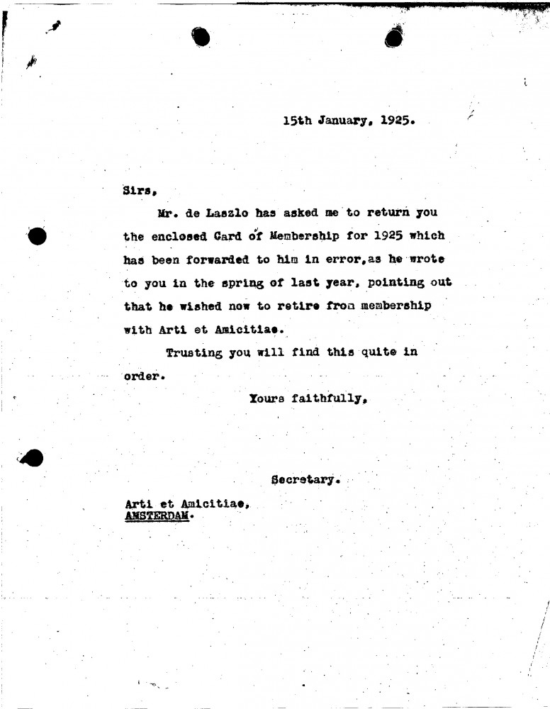 De László is retiring his membership from Arti et Amicitiae; he returns their 1925 membership card.