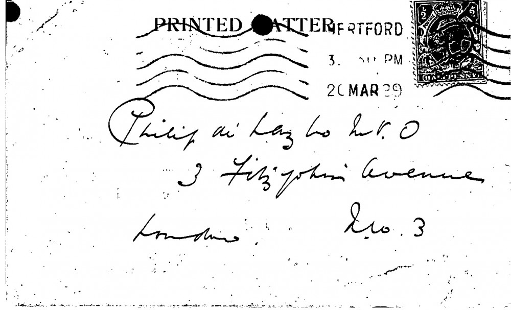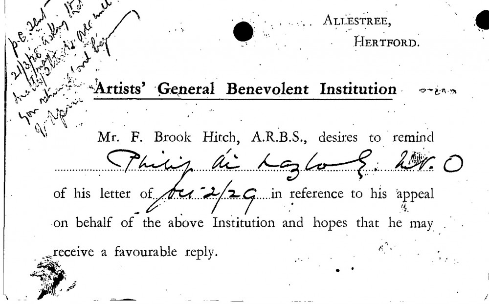 A reminder to de László concerning an appeal from the Artists' General Benevolent Institution.