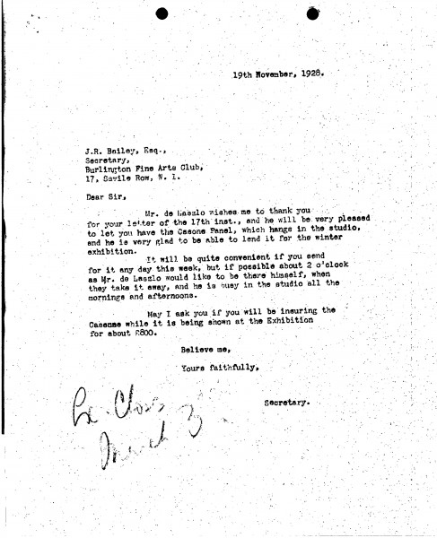 Regarding collection of de László's Cassone panel [113447] for the Burlington Fine Art Club's winter exhibition.