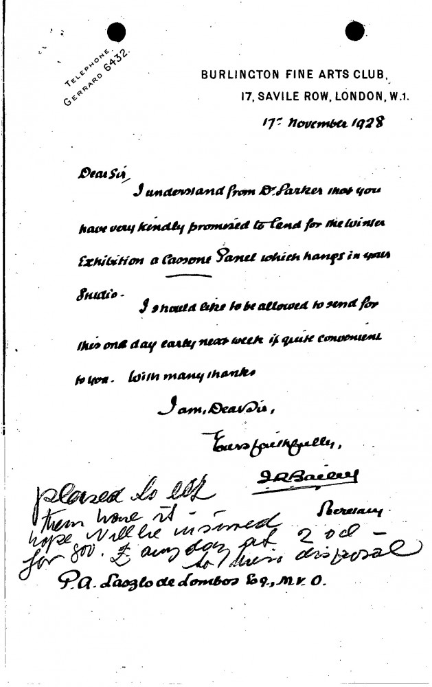 Regarding collection of de László's Cassone panel [113447] for the Burlington Fine Art Club's winter exhibition.