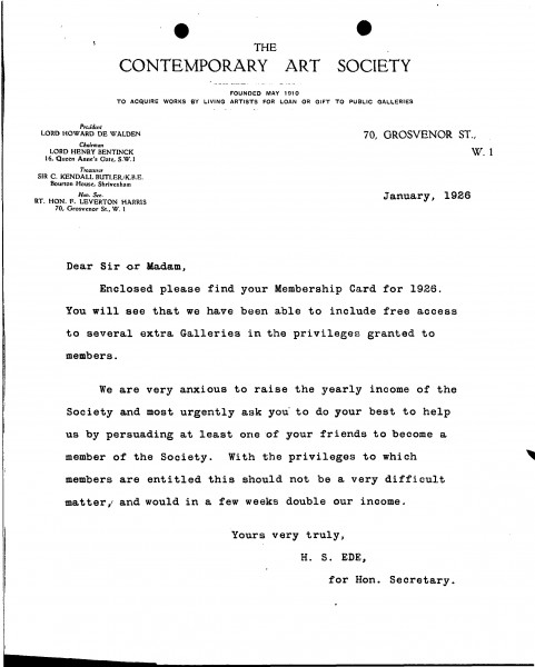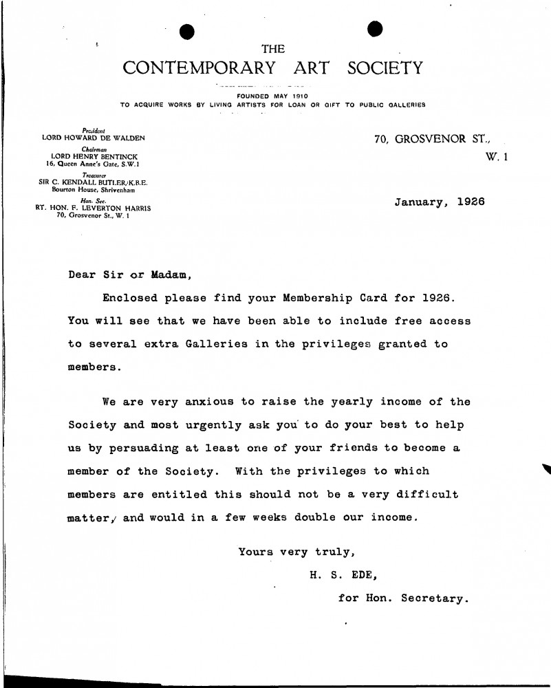 Previous See list Next 105-0039 de Laszlo Archive © de Laszlo Foundation 105-0039 01/01/1926 1926 membership card for the Contemporary Art Society. Accession number 105-0039 Type Letter Sender Ede, H[arold] S[tanley] "Jim" (1895 - 1990) Location Public Collection, National Portrait Gallery, London Close 105-0039 Letter from H. S. Ede to de László, Studio Correspondence Nov 1920 - Apr 1924 Various Art Societ, 105-0039