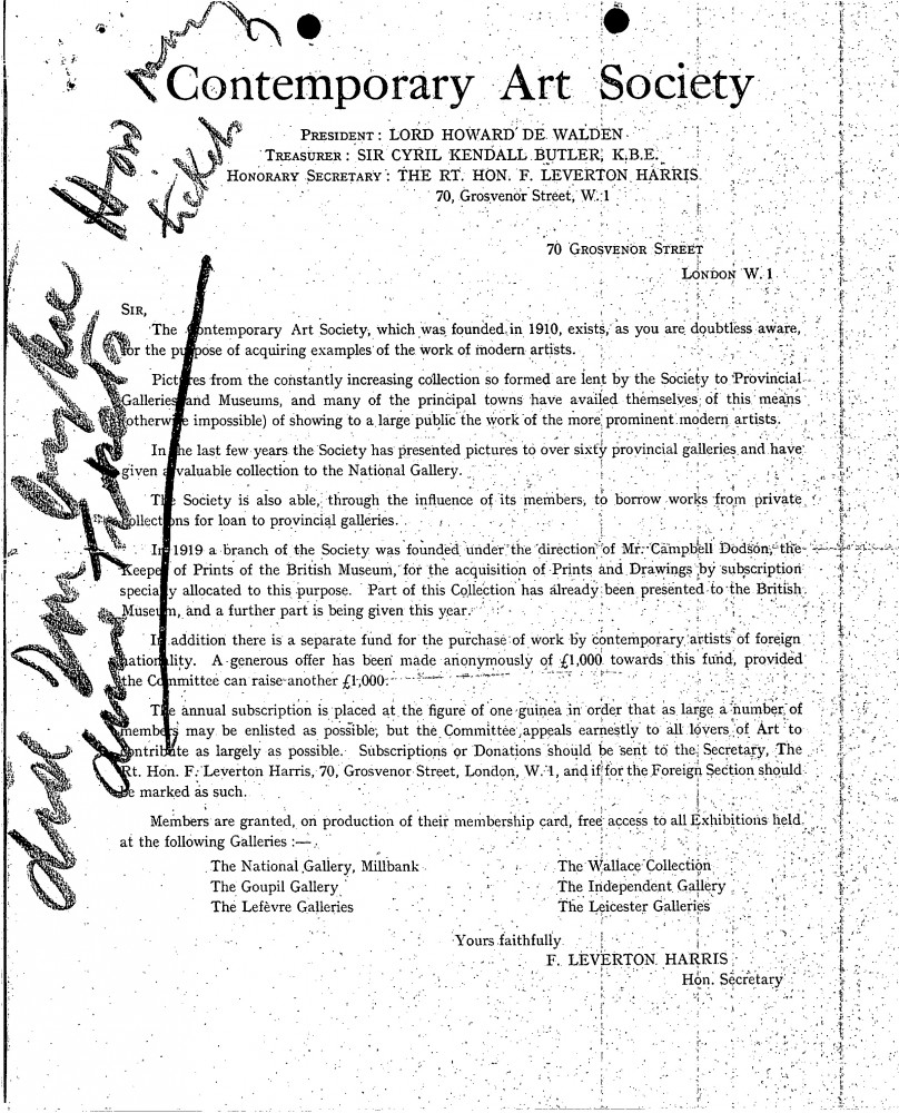 Information concerning the Contemporary Art Society. See also DLA105-0046. Item includes a handwritten annotation in de László's hand concerning tickets.