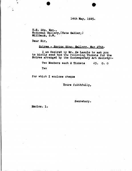 Ticket request and enclosed cheque for a soirée arranged by the Contemporary Art Society.