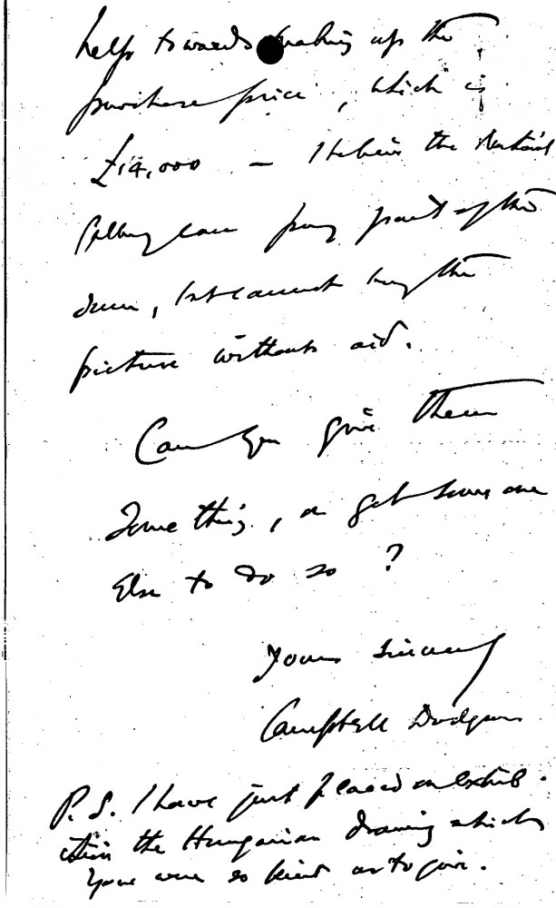 Appeal for a contribution from de László towards the purchase of a portrait by Tintoretto for the National Gallery. The drawing by Bertalan Székely, given by de László to the British Museum, has been placed on exhibition.