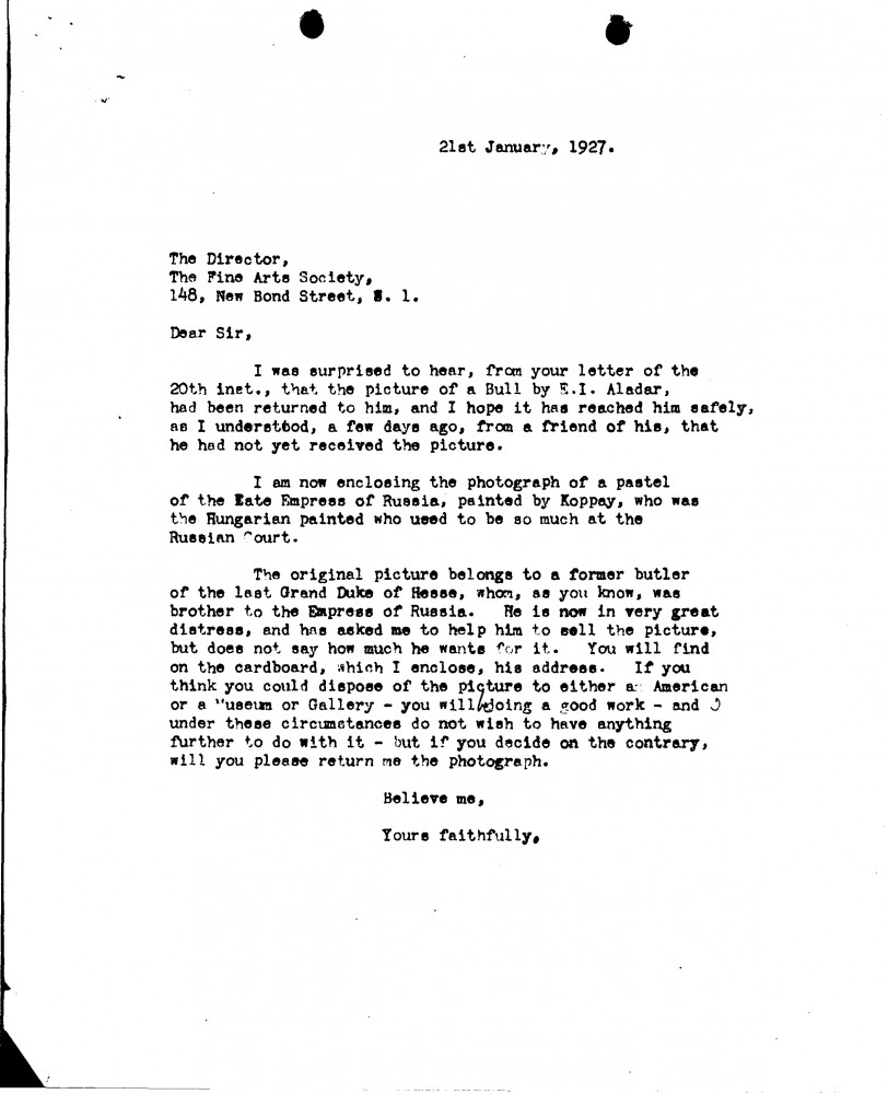 Surprised Aladár Edvi Illés's picture has been returned. Would the gallery be able to sell a pastel of the late Empress of Russia by the artist Koppay? The owner, former butler of the last Grand Duke of Hesse, needs to sell.